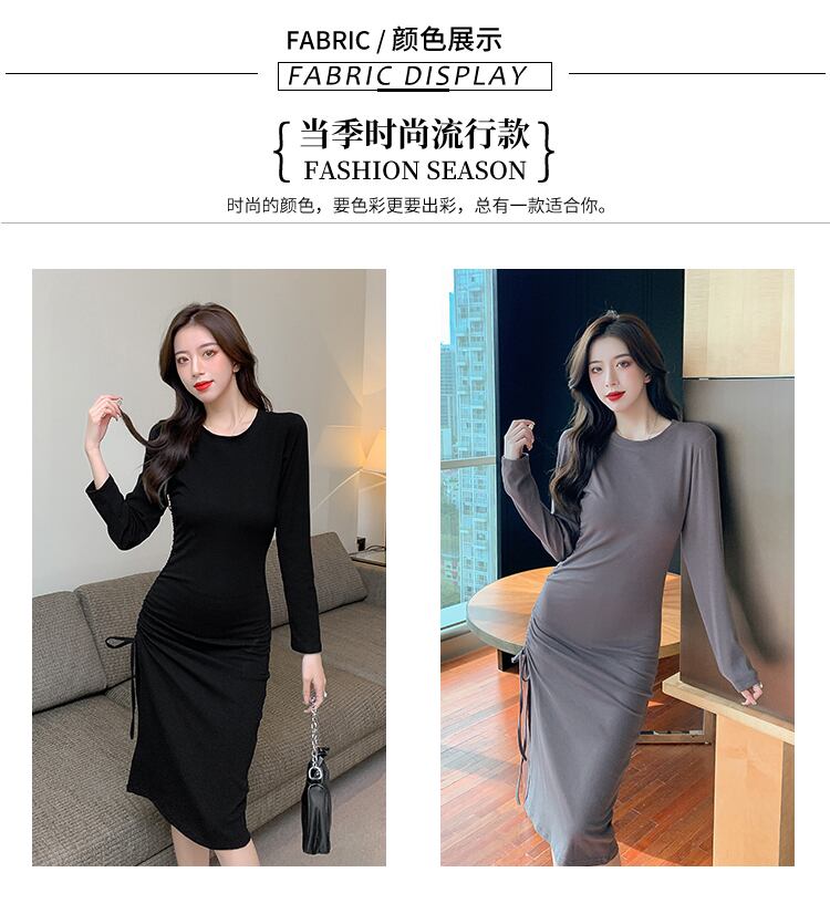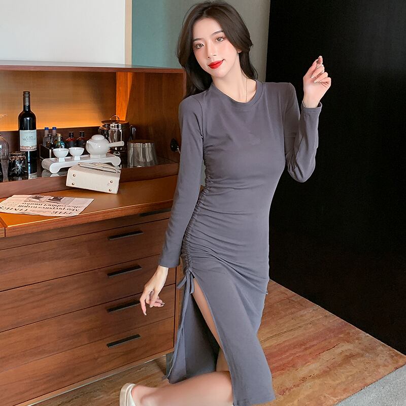 秋の婦人服2021年新ウエストスリミング気質デザインセンス巾着セクシーイレギュラースプリットドレス オータム 秋物 yingd29288236584