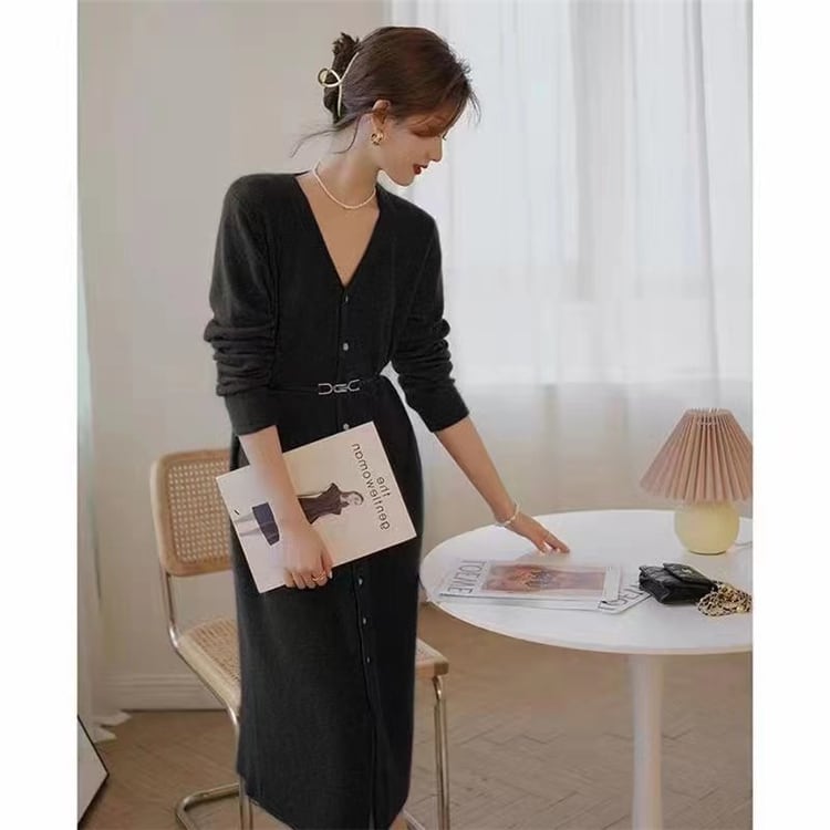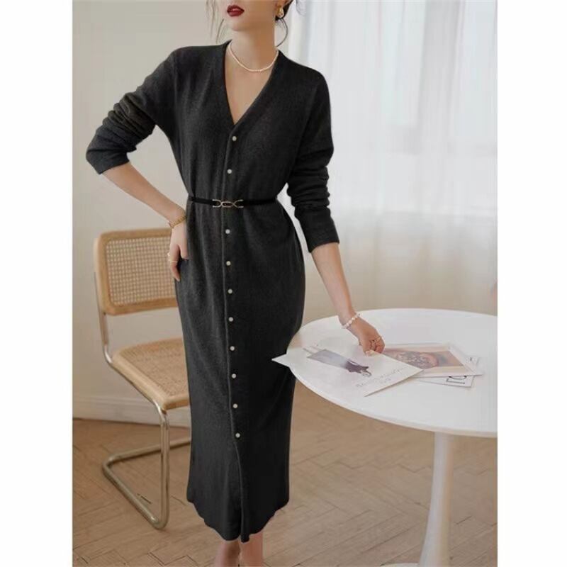 フランスのレトロなヘップバーンスタイルの赤い長い膝上セータードレスコートニットドレスの女性とVネックの高い感覚 ロング レッド yingd38501510773