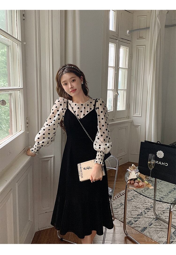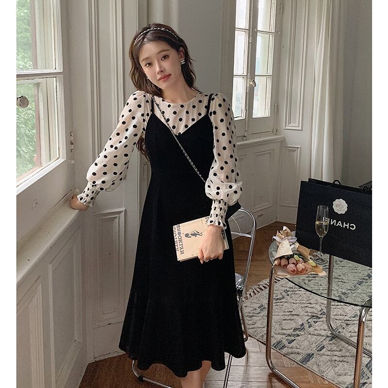 フランスのレトロなサスペンダースカートツーピース女性2021年初秋新しいレトロな水玉ブラウスベルベットドレススーツ オータム 秋物 yingd90435028755