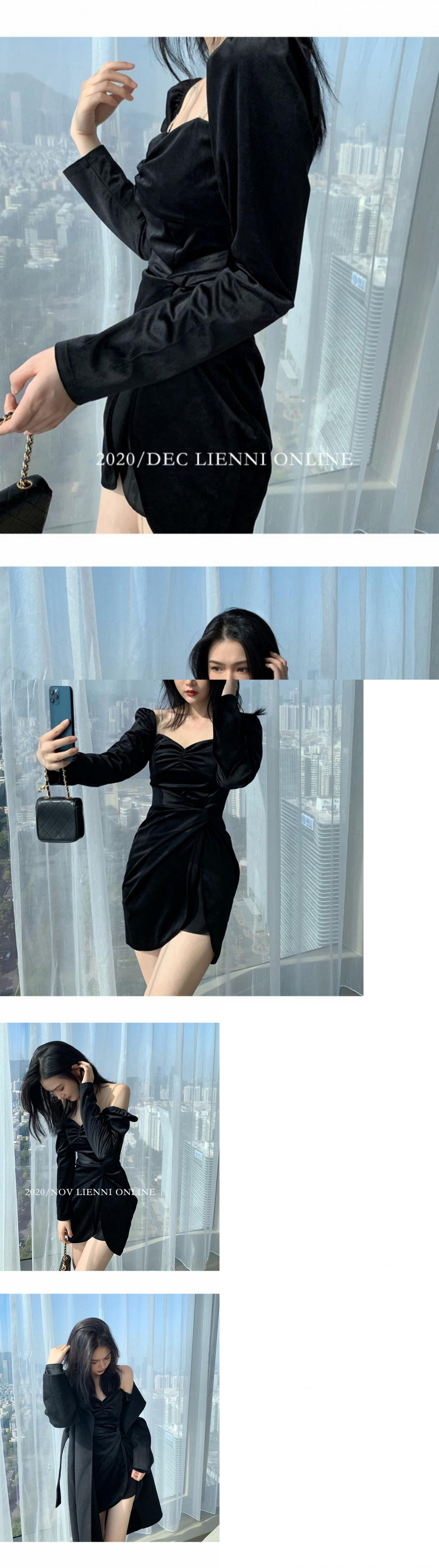 フレンチブラックドレス、ヘップバーンスタイル、ウエスト、細い気質、軽くて贅沢なデザイン、スカート、不規則なスクエアネックのベルベットドレス スクウェア yingd21089608540