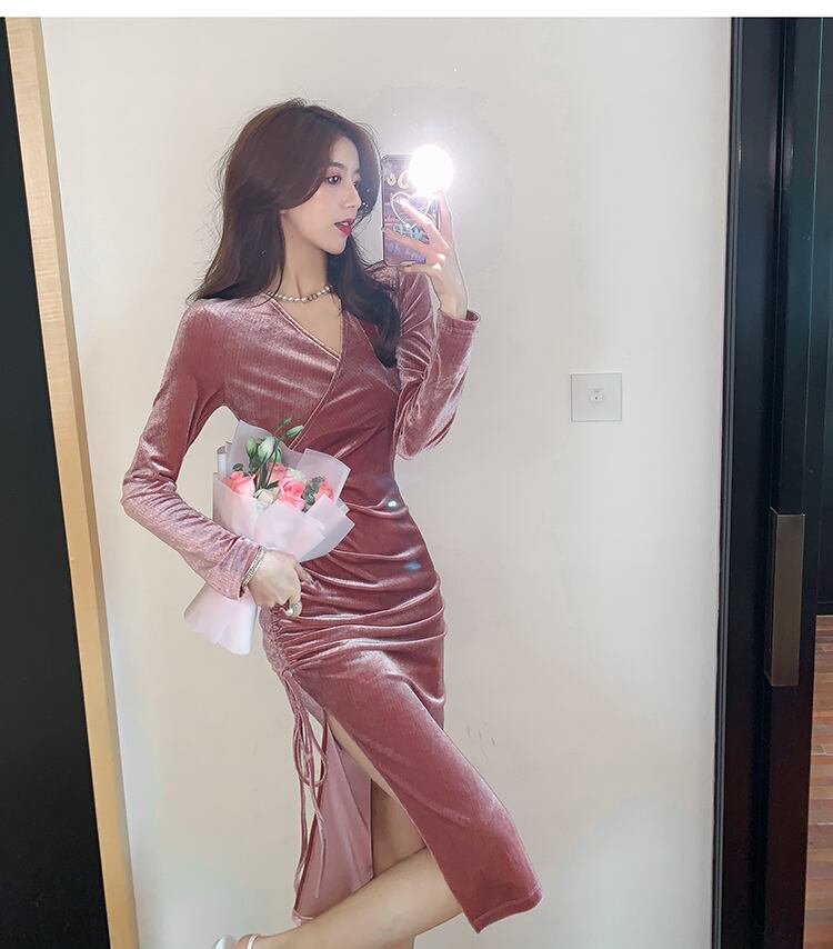 フランスのレトロなコールドスタイルの女性のハイエンドクロスVネックデザイン巾着スプリットベルベットドレス秋と冬 オータム 秋物 ウィンター 冬物 yingd61637639341