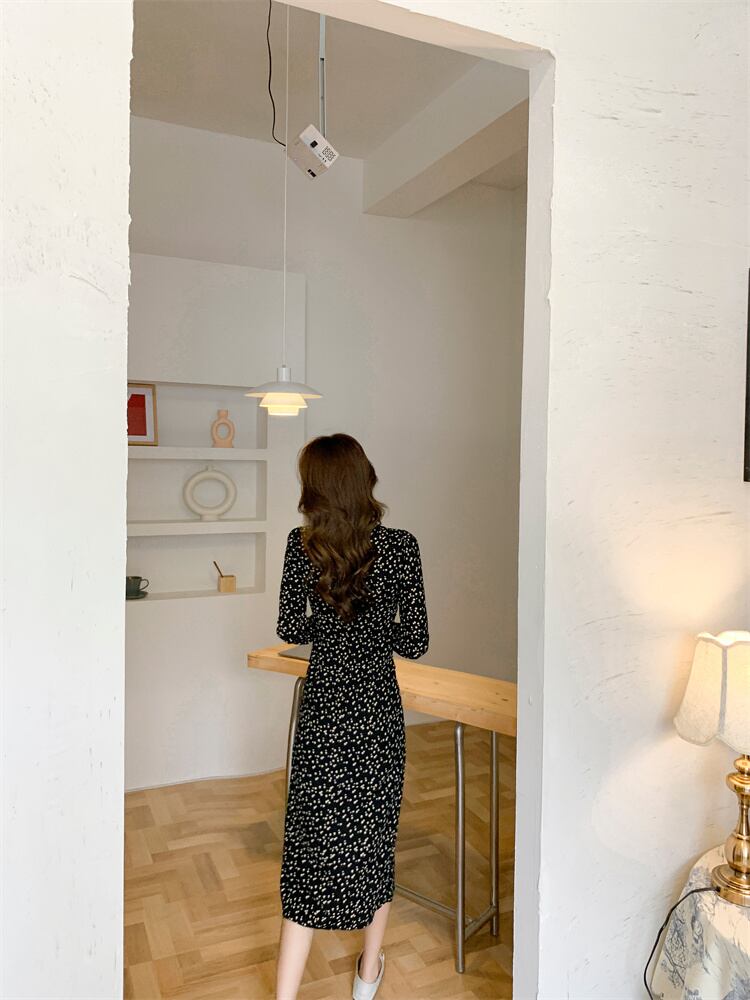 初秋の服2021新しいフランスのレトロなデザインセンスヘップバーンスタイルの黒のセクシーなスプリットフローラルドレスの女性 ブラック オータム 秋物 花柄 yingd30422261063