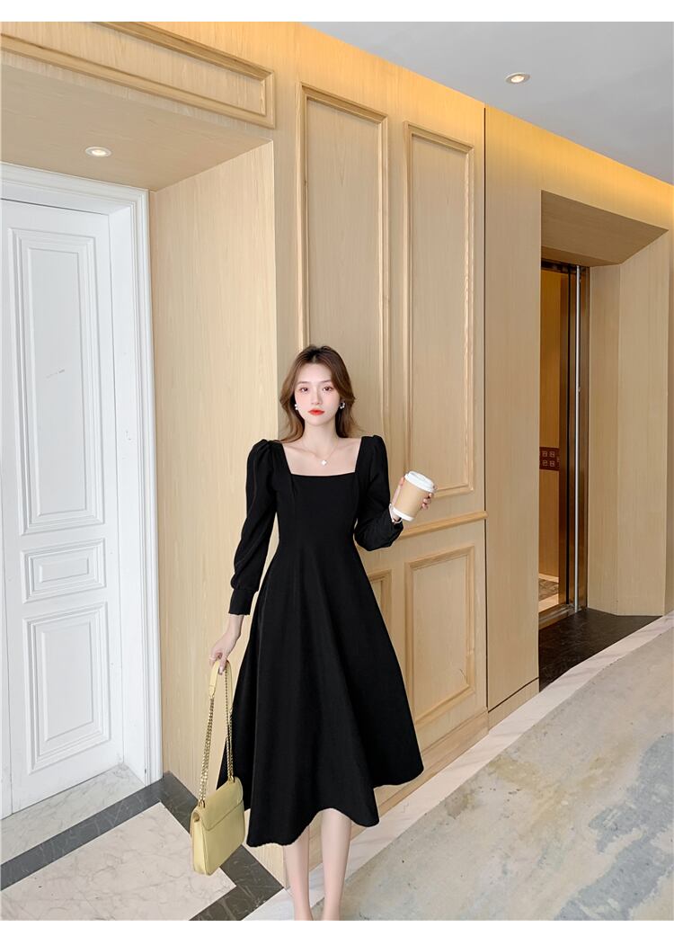 フランスのレトロなヘップバーンスタイルのロングスカートのウエストは薄く、クールな気質、スクエアネックのハイエンドなセンスの黒いドレスの女性の秋 ブラック オータム 秋物 スクウェア yingd49800599704