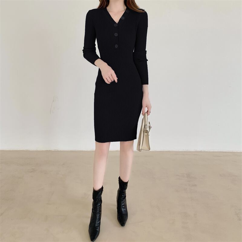 気質フェミニンでセクシーなタイトフィットヒップセータードレス女性デザインセンスニッチVネックボタンニットスカート yingd516154839