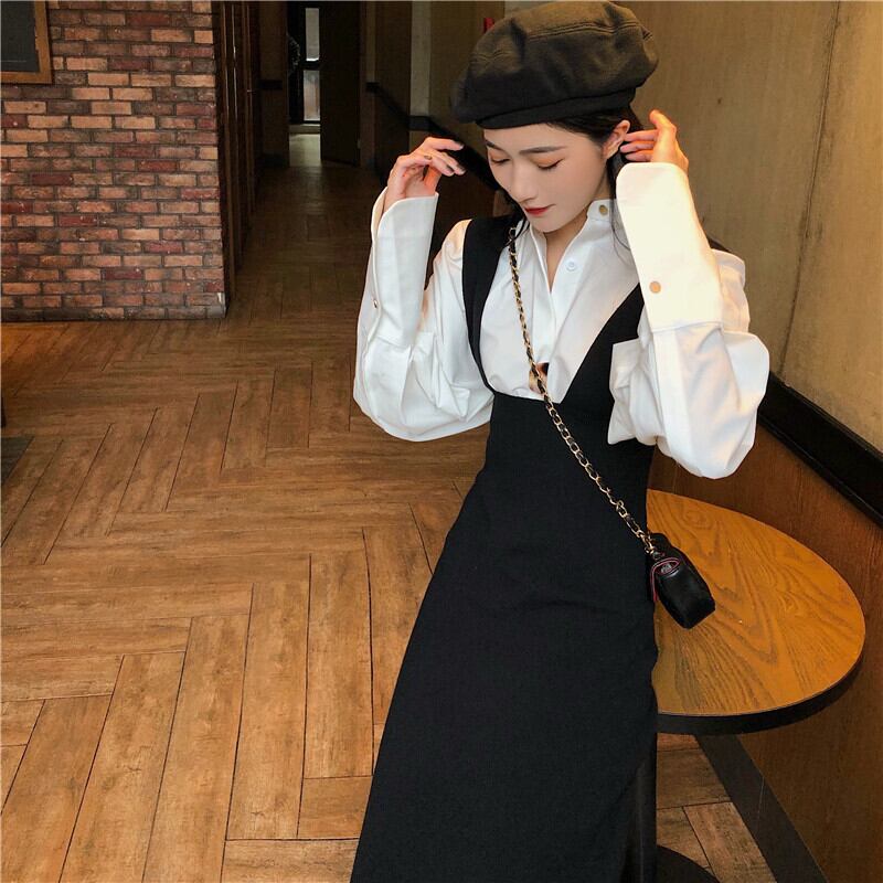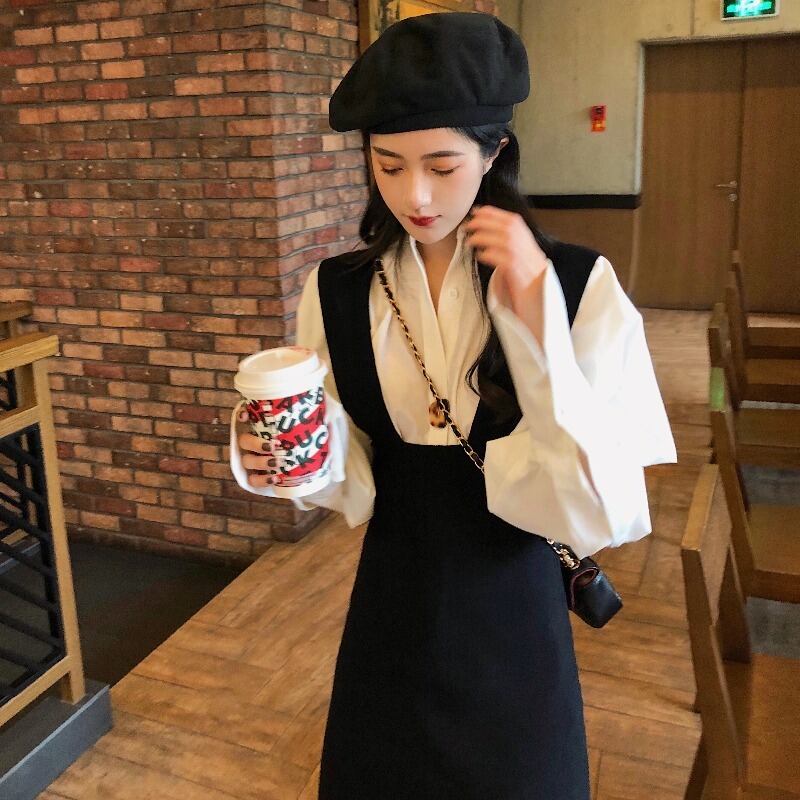 フランスのレトロな気質の女神ファン・ユウジエ、軽く調理された洋風、年齢を減らすシャツ、黒のニットサスペンダースカート、ツーピーススーツ ブラック yingd20565539808