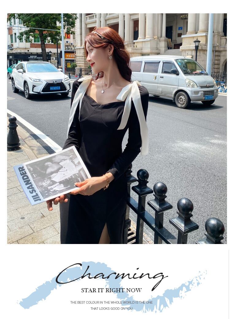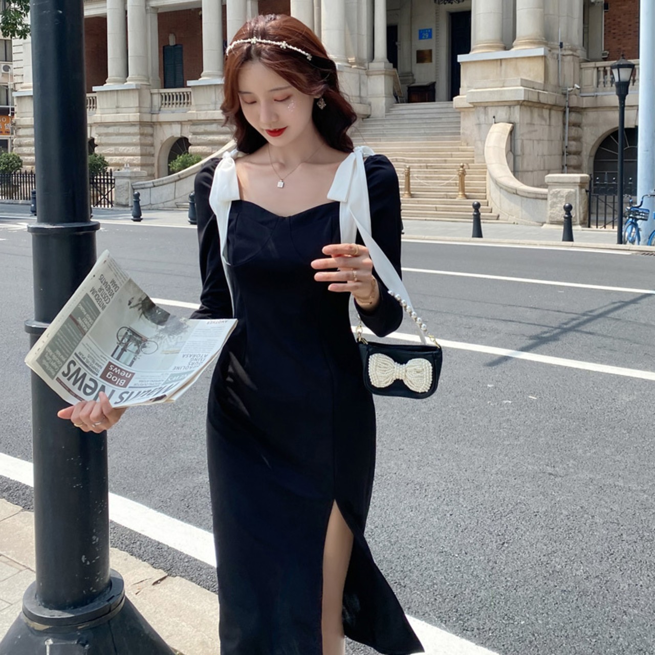フランスのレトロなヘップバーンスタイルの小さな黒いドレススリムな痩身気質ハイセンスロングセクシーなスプリットドレス女性の秋 ブラック オータム 秋物 yingd88907600708