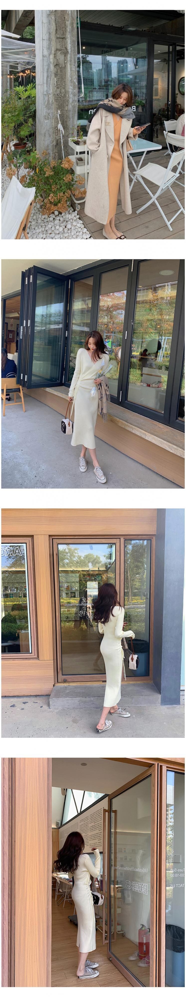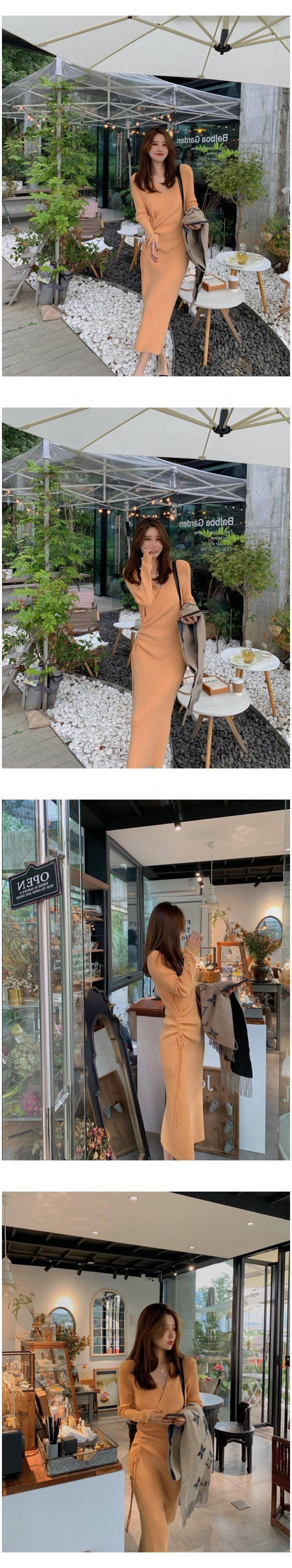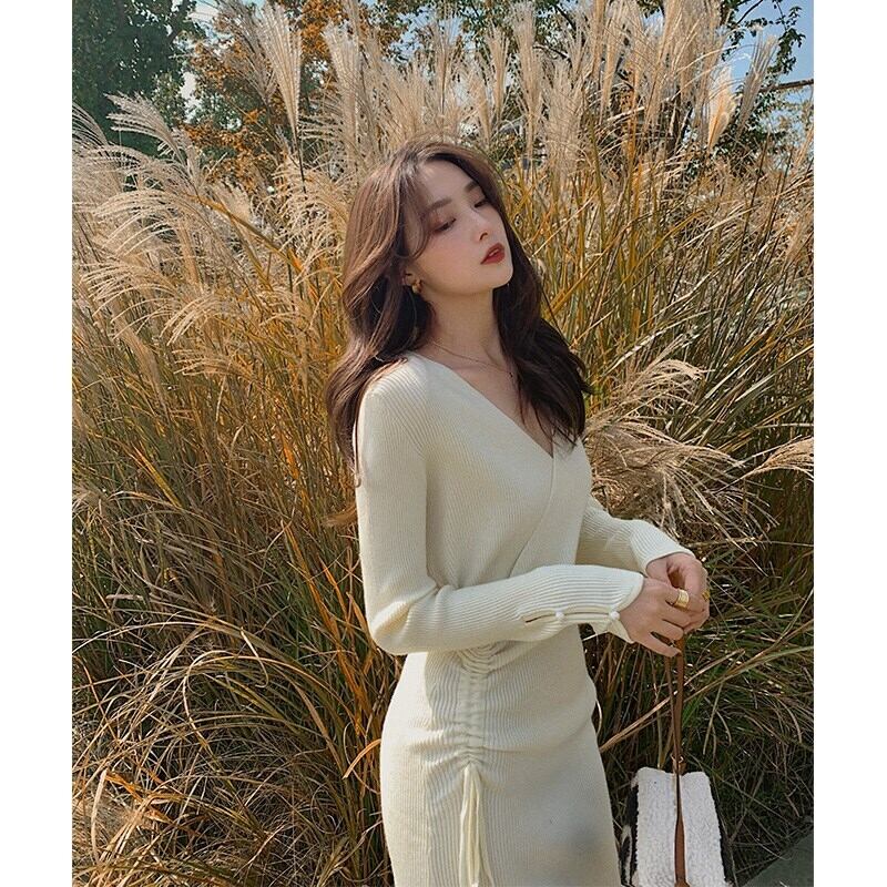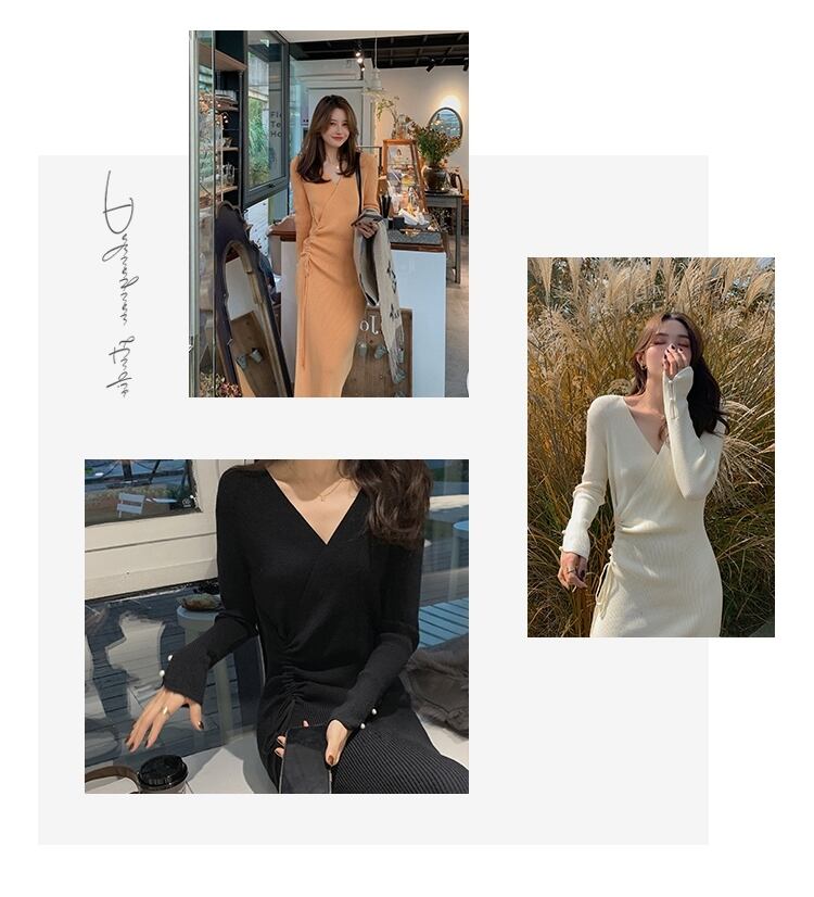 フランスのレトロな優しいティーブレイクニットロングスカートデザインセンスニッチ巾着Vネックボトミングセータードレス女性 yingd13548679094