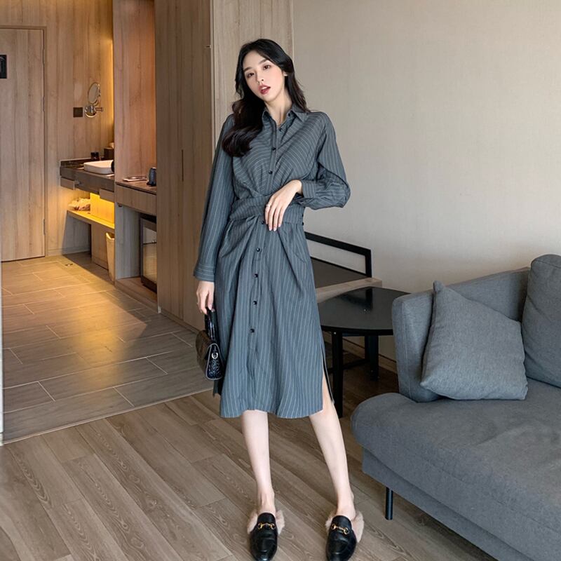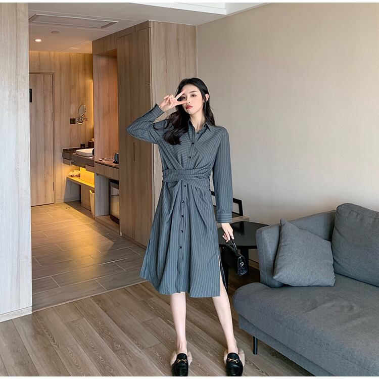 ロングセクションウエストウエストのフレンチレトロデザインストライプシャツドレスは薄気味の長袖シャツドレス女性秋 オータム 秋物 yingd15268214921
