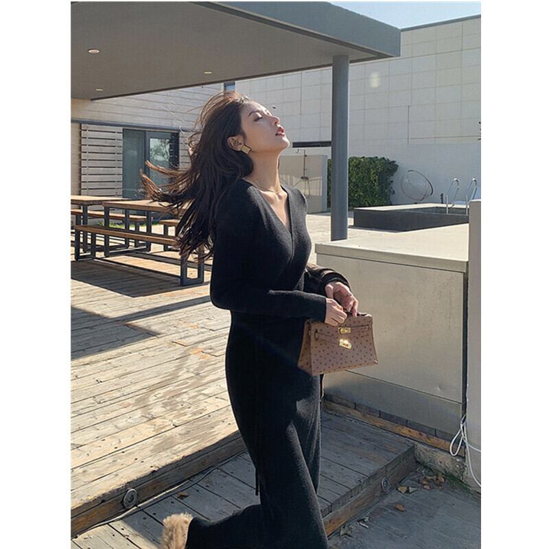 2021年秋新しいフレンチスタイルのオーバーザニーハイエンドデザインセンスニッチVネックセーターロングスカートニットドレス女性 オータム 秋物 yingd97039747947