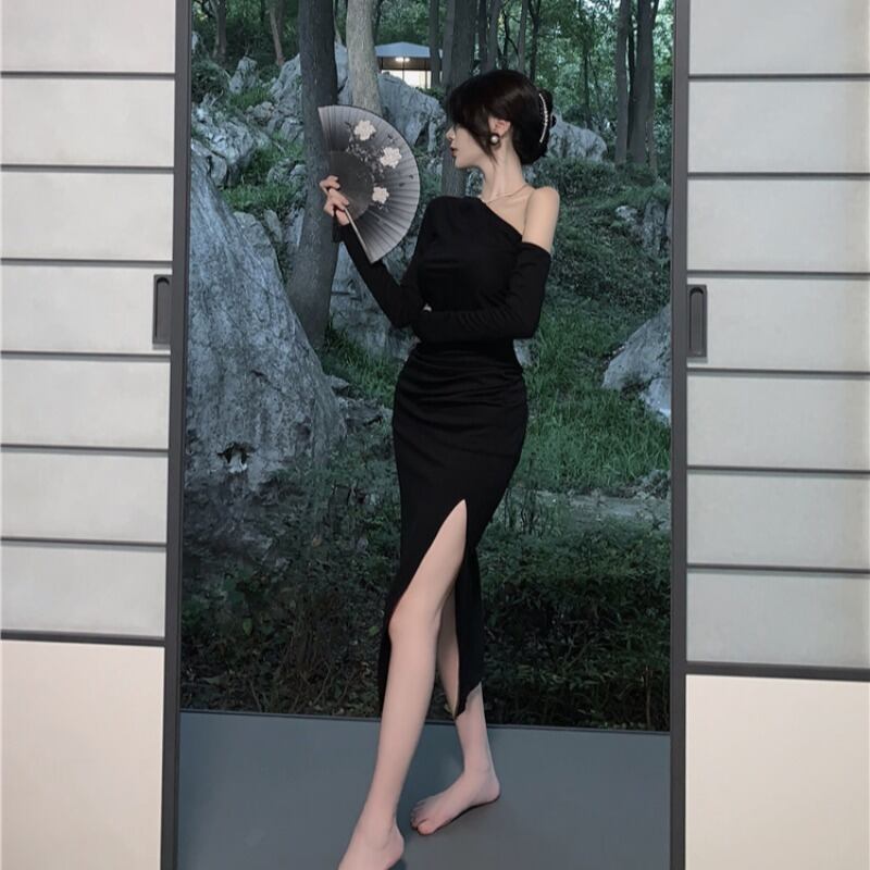 フランスのレトロなコールドスタイルの女性の高級感のある高級感ライトラグジュアリーロングスカートスリムスリムセクシースプリットオフショルダードレスレディース yingd33903810377