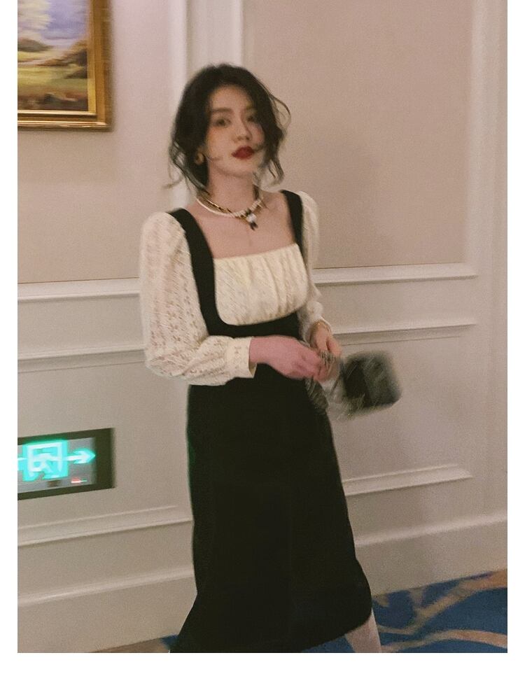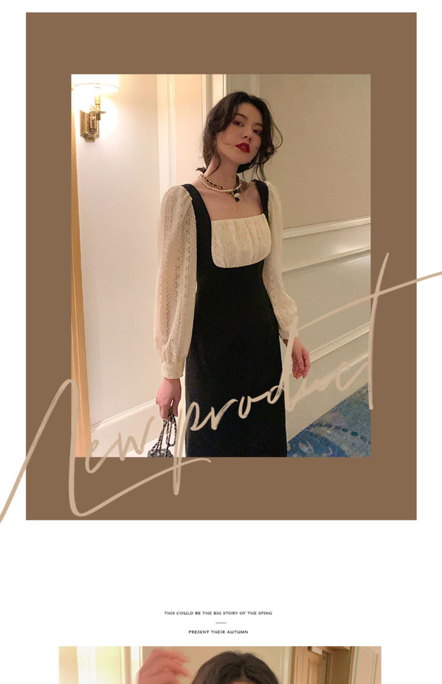 ウエストウエストのフレンチレトロヘップバーンスタイルのリトルブラックドレスは、薄く、軽く、豪華な、レディースデザインセンスレーススクエアネックドレスでした スクウェア yingd51721071075