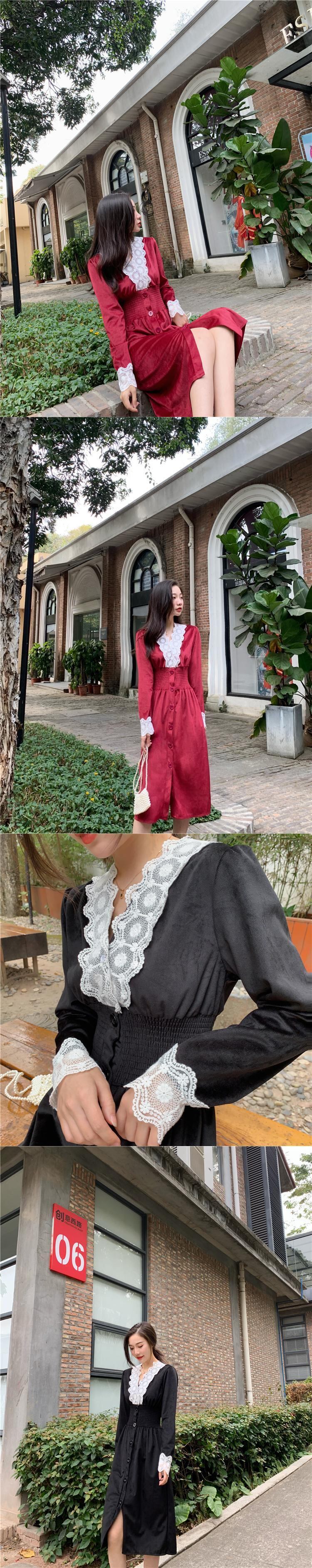 フランスのレトロな気質Vネックミドル丈オーバーザニーレッドドレス女性の秋と冬のウエストは薄く、内側のベーススカート オータム 秋物 ウィンター 冬物 yingd14260975935