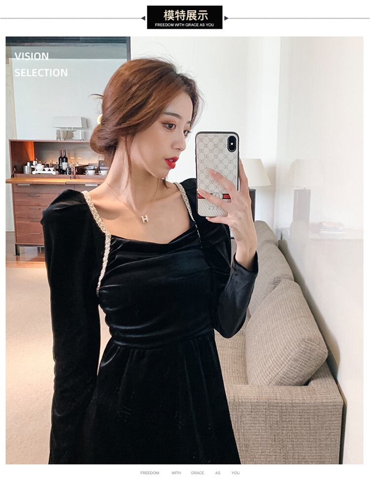 フランスのレトロなヘップバーンスタイルのスクエアカラーのウエストは薄く、軽くて贅沢な女性の長袖ベルベットドレスの女性の秋と冬でした ロング オータム 秋物 ウィンター 冬物 スクウェア yingd13243965840