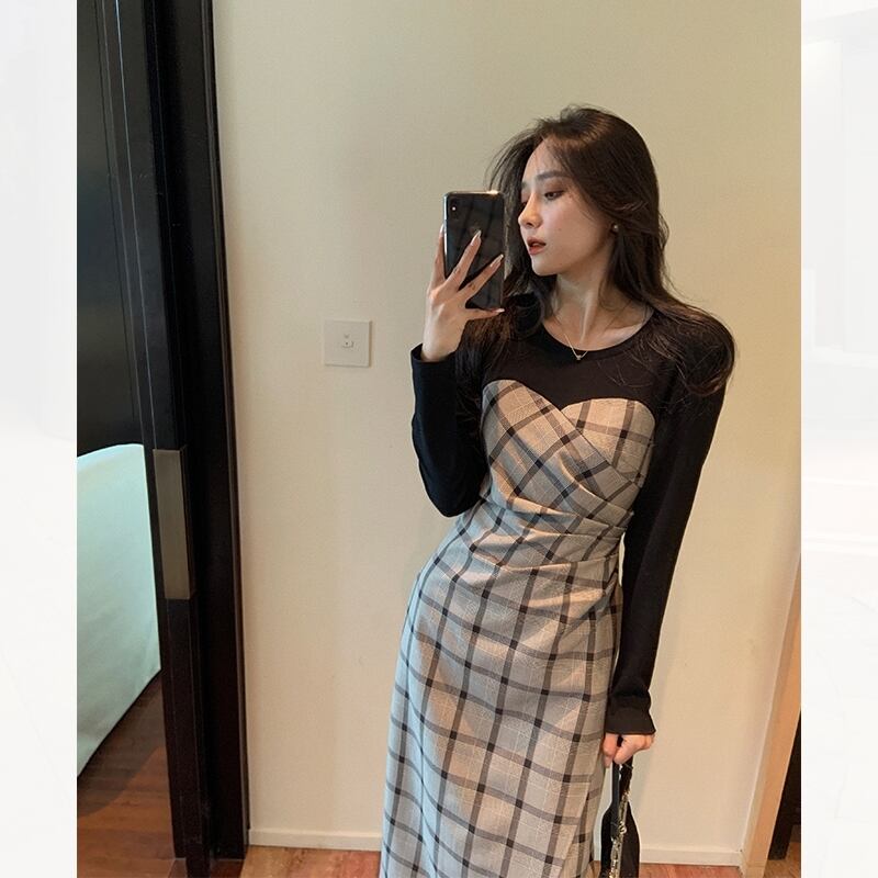 2021年秋新しいフランスのレトロなウエストウエストは薄く、ハイエンドの女神ファンハイエンドの偽のツーピーススプライシングドレス オータム 秋物 yingd82225121929