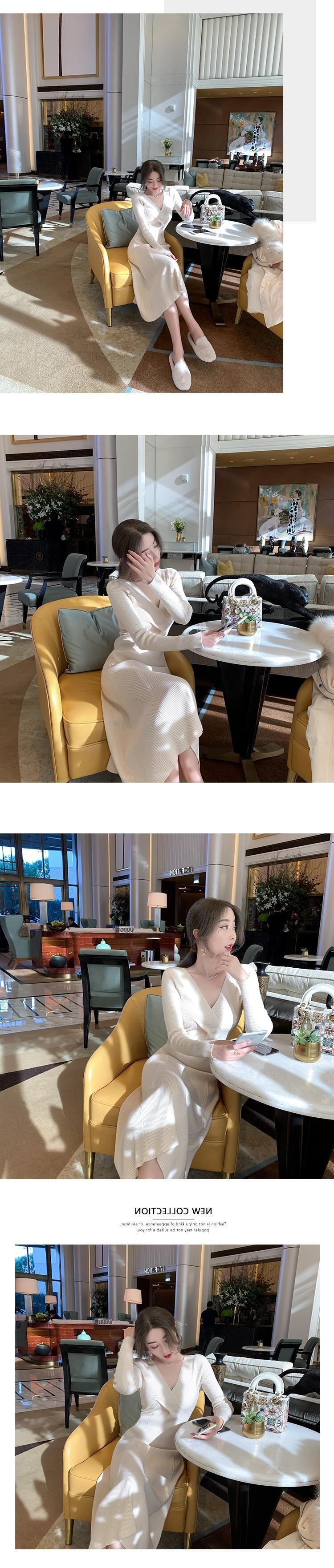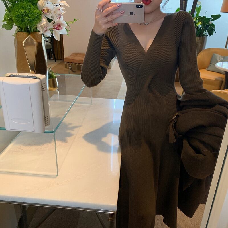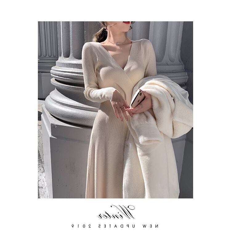 フランスのレトロなデザインのニッチな長い膝上セータードレス、ウエストと細い気質のVネックニットドレスの女性 ロング yingd21892488254