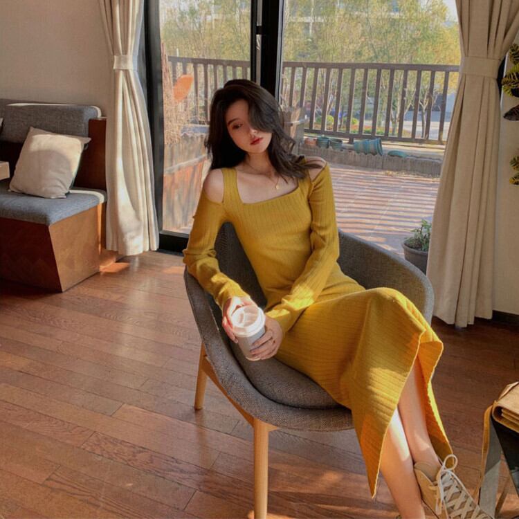 フレンチレトロ気質フェミニンセクシーオフショルダーセーターロングスカート冷風ハイセンスニットワンピース女性秋 オータム 秋物 yingd38071601171