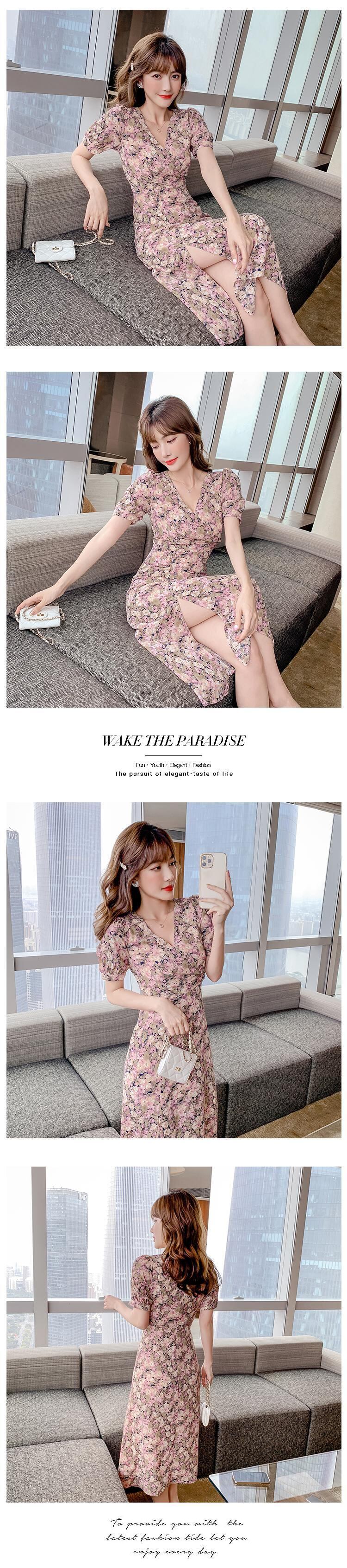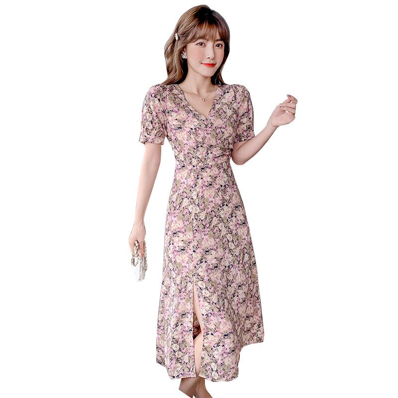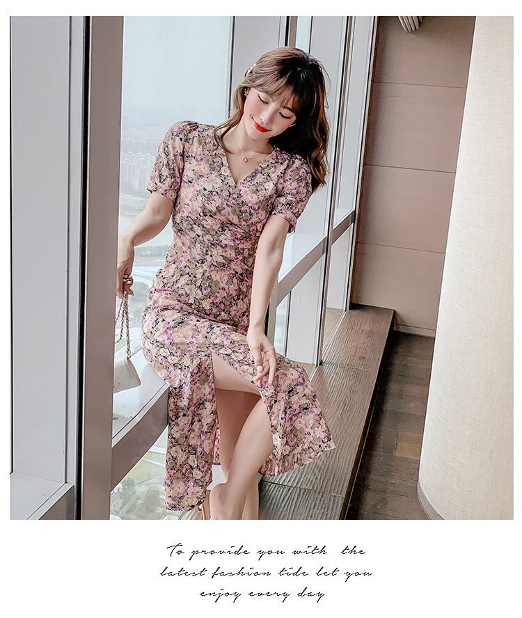 フランスのレトロな優しいティーブレイクキキョウスカートウエストは薄くてセクシーなスプリットシフォンフローラルドレス夏 サマー 夏物 花柄 yingd96596542309