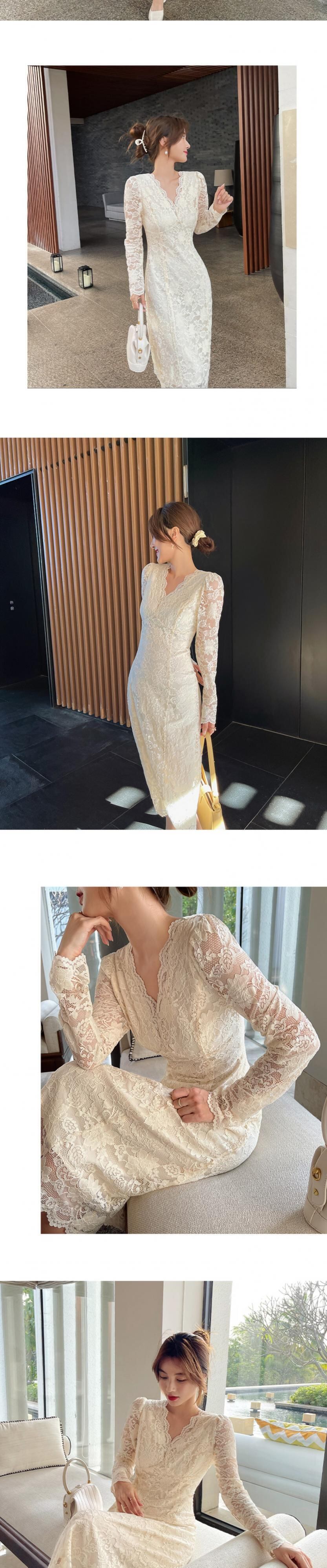 2021年秋新しい穏やかな風のハイエンド膝上ロングスカートスリムで薄い気質Vネックレースドレスの女性 オータム 秋物 yingd40463751057