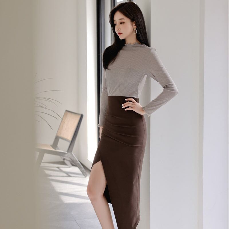 初秋の服2021新しいコールドスタイルの婦人服ハイエンドの軽い高級感スリムでセクシーなスプリットエンドのコントラストカラーのドレスの女性 オータム 秋物 yingd19209206012