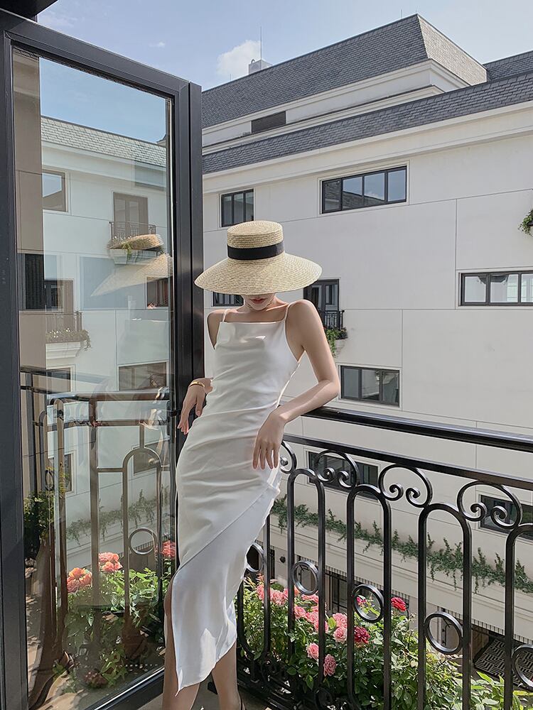 フレンチレトロライトラグジュアリーセレブヘップバーンスタイルサスペンダードレス不規則なデザインセンスのスイングカラーサスペンダードレス女性の夏 サマー 夏物 yingd28235255166