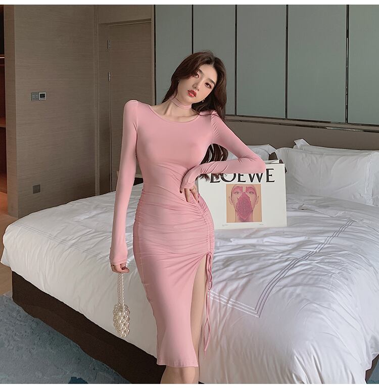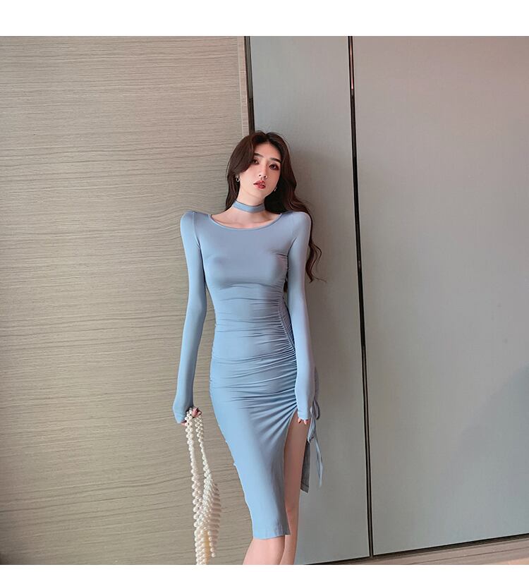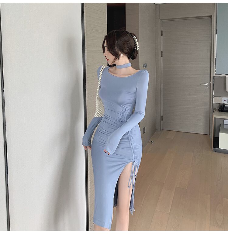 フランスのレトロなデザインのニッチな巾着長い膝上ドレススリムホルターセクシーなスプリットドレス女性の秋 ロング オータム 秋物 yingd78099860471