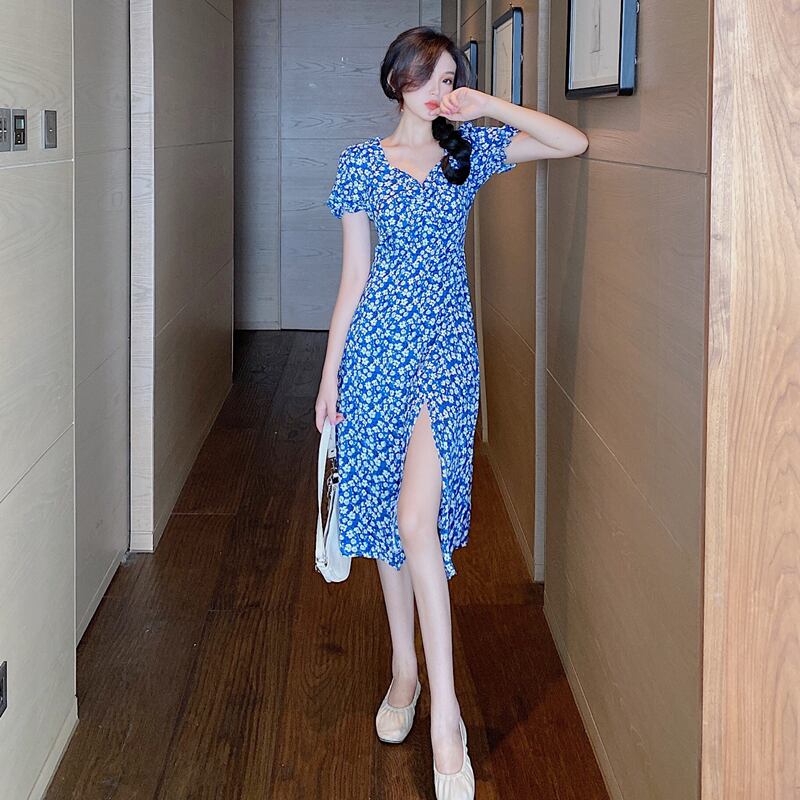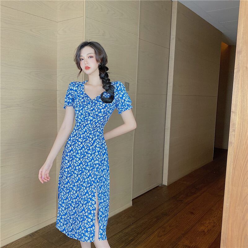 2020年夏フレンチレトロセクシーサイドスプリットパフスリーブフローラルドレスレディースウエストウエストと薄い気質 サマー 夏物 花柄 yingd37368763635