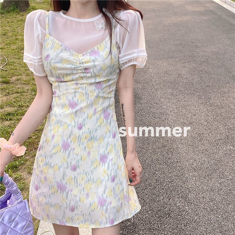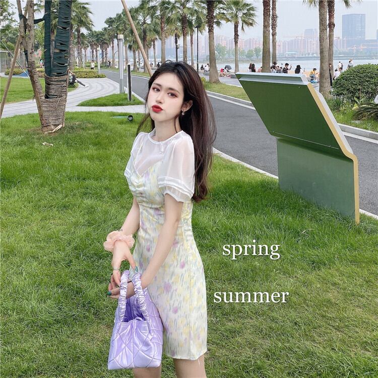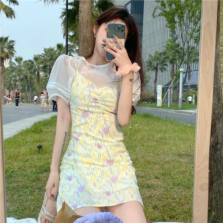 2020年夏の新しいフレンチレトロパースペクティブパフスリーブトップフローラルスリングドレス女性スーツツーピース サマー 夏物 花柄 yingd97842379410