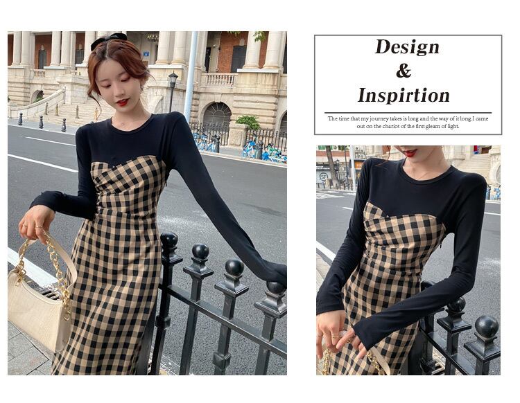 2021年秋新しいコールドスタイルの婦人服ハイエンドライトラグジュアリーレディースデザインセンスステッチチェック柄ドレスレディース オータム 秋物 yingd12533584950