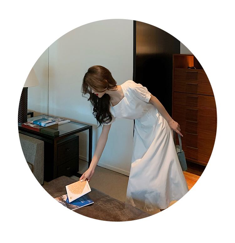 フランスのレトロなスクエアネックパフスリーブロングスカートは薄くて気質が高く、軽い成熟した風のウエストの白いドレス女性の夏のドレス ホワイト サマー 夏物 スクウェア yingd55270025349