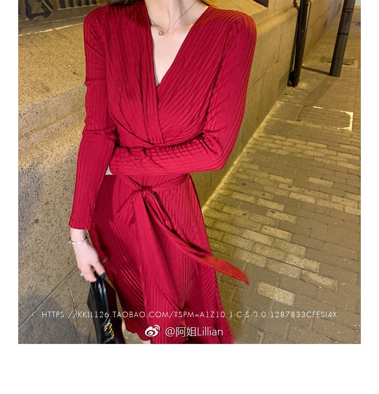 フランスのレトロな膝丈のドレスは薄くて気質の高いヘップバーンスタイルのセクシーなVネックの赤いドレスの女性の秋と冬でした レッド オータム 秋物 ウィンター 冬物 yingd85958983797