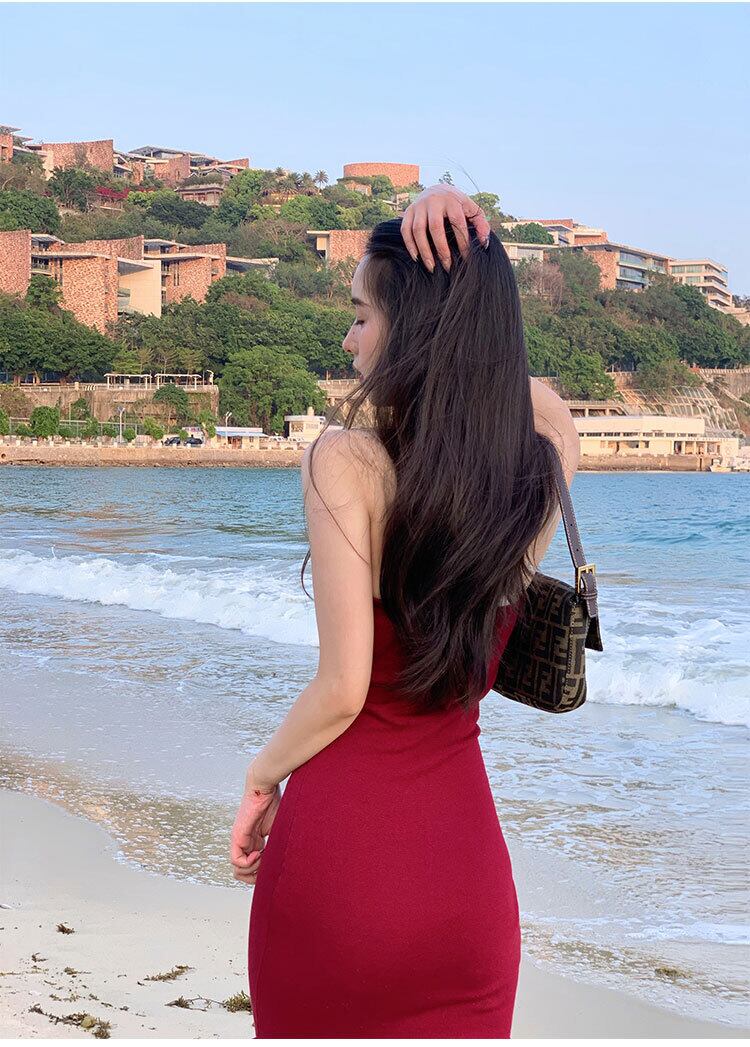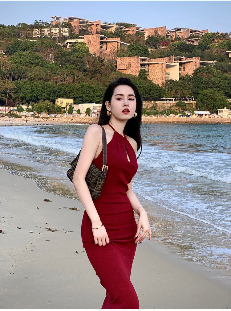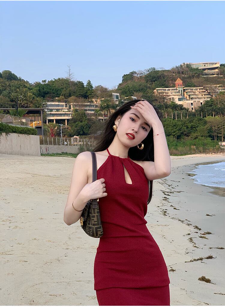 フランスのセクシーなタイトフィットバッグヒップロングスカートウエストは細くて気質ハンギングネックスプリットレッドニットドレス女性の夏 サマー 夏物 yingd84562949884