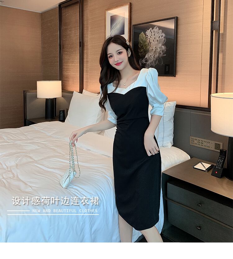 フランスのレトロなヘップバーンスタイルのウエストは細く、気質の女神ファンのコントラストの高い色のプリーツスクエアカラードレス女性の夏 サマー 夏物 スクウェア yingd46945339260