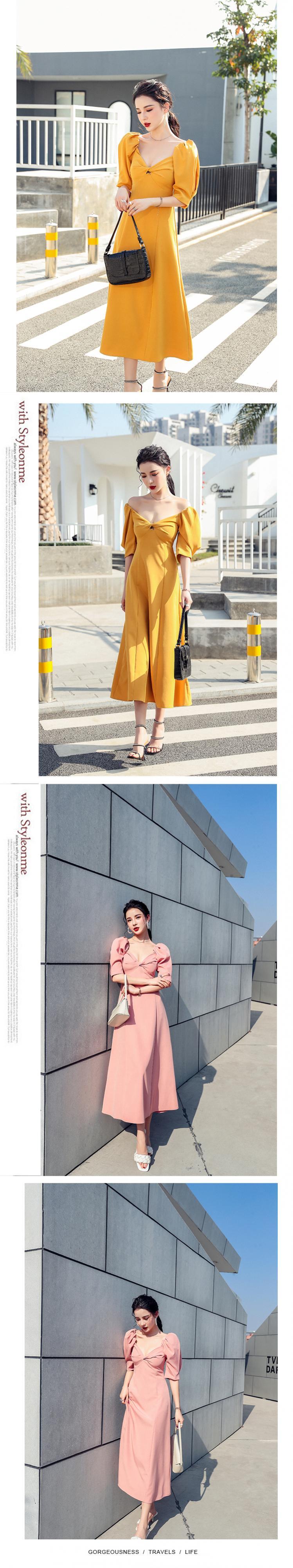 フランスのレトロなヘップバーンスタイルのロングスカート夏のデザインセンスニッチセクシーなスリムウエストスクエアネックパフスリーブドレス女性 サマー 夏物 スクウェア yingd62978680373