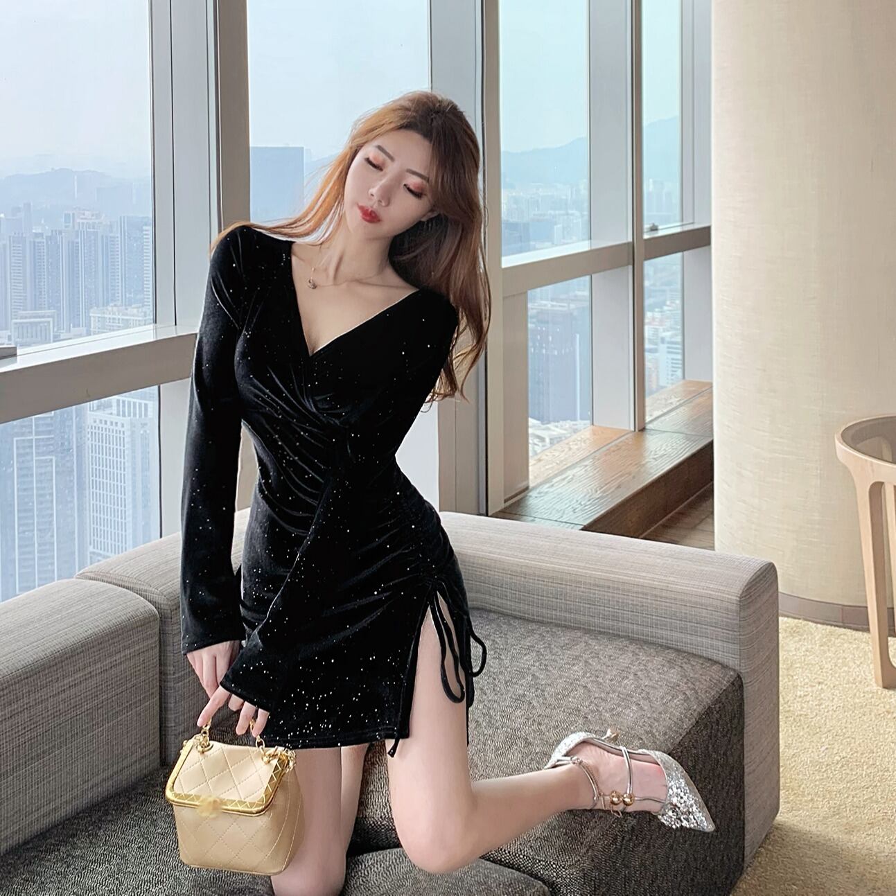 フランスのレトロなヘップバーンスタイルのリトルブラックドレスのウエストは細く、折り目とスリットのデザインセンスがきらめくベルベットドレス yingd97194720452