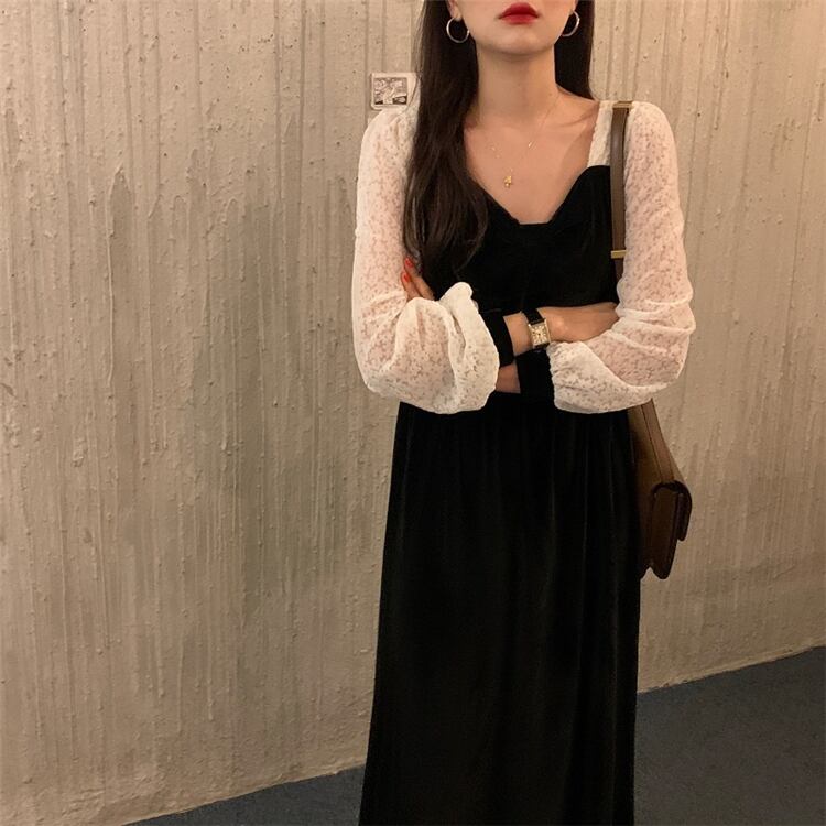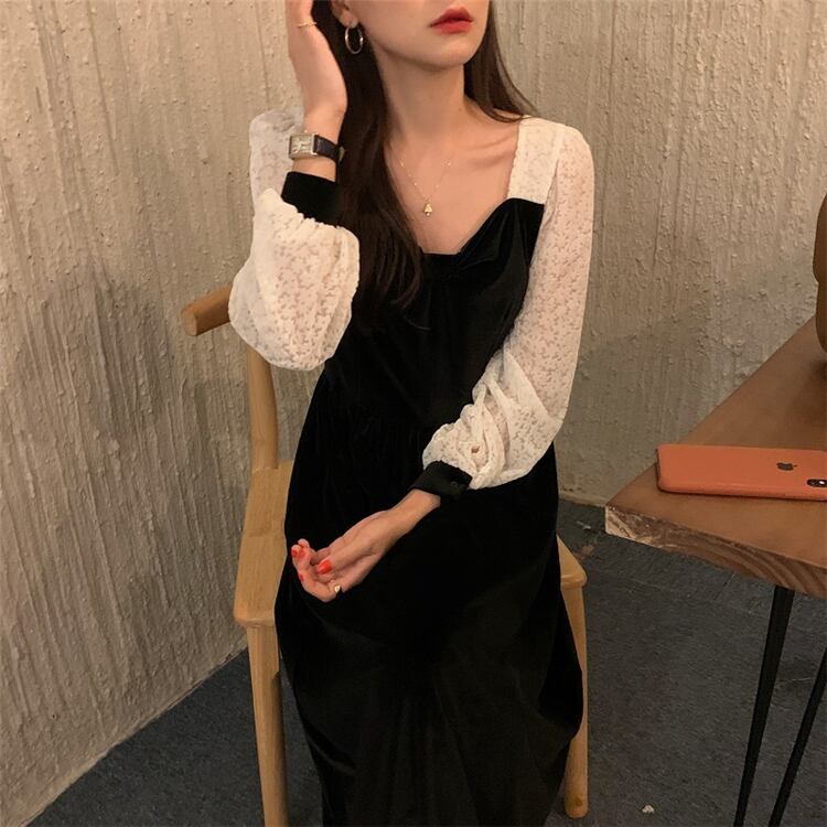フランスのレトロなヘップバーンスタイルのリトルブラックドレス、ハイエンドのライトラグジュアリーレディースレースステッチベルベットドレス女性の秋と冬 オータム 秋物 ウィンター 冬物 yingd23789912646