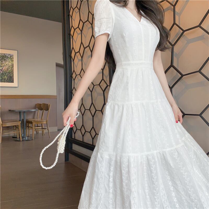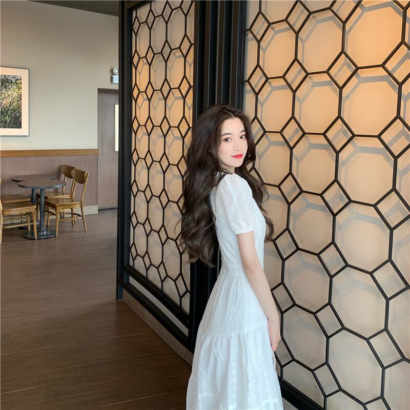 フランスのレトロなニッチキキョウグランディフロラム初恋妖精スカート気質女神ファンパフスリーブ優しい風白いドレス女性 ホワイト yingd67641428928