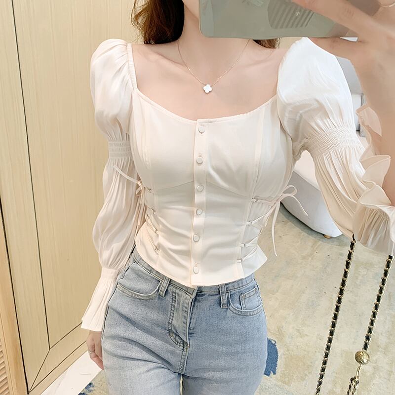 2021年初秋新作フレンチショートトップデザインセンスニッチウエストウエスタンスタイル長袖スクエアネックシフォンシャツレディース ロング オータム 秋物 スクウェア yingd37044186847