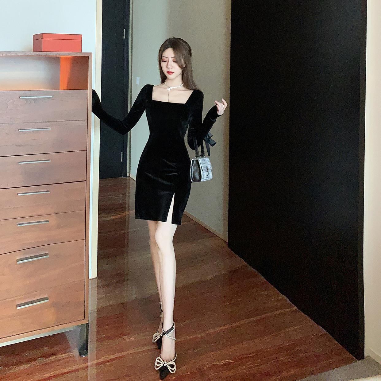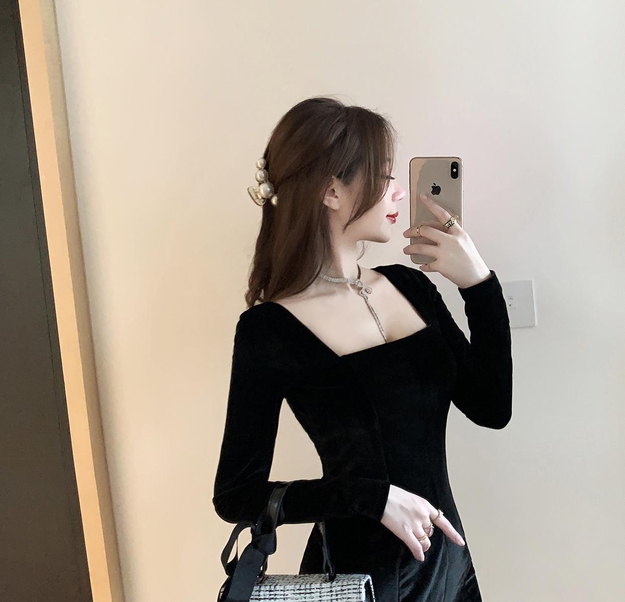 フランスのレトロなフェミニンなフェミニンなセクシーなスリムな痩身ヘップバーンスタイルの高品質の長袖スクエアネックベルベットドレス ロング スクウェア yingd68704351224