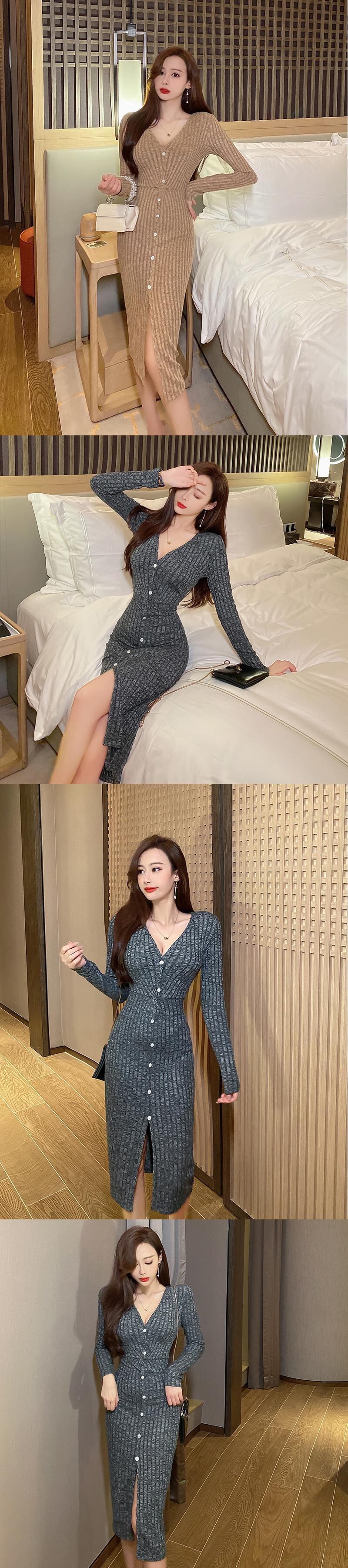 フロスティスタイルの女性のハイレベルなセンス、軽い贅沢な気質、フェミニンなユウジエの軽い成熟したスタイルのセクシーなVネックスプリットドレスの女性 yingd48691476671