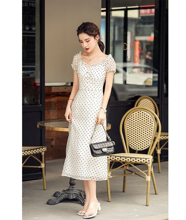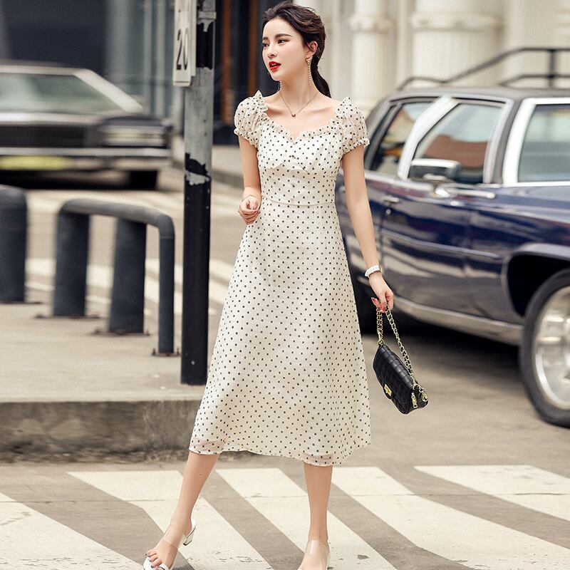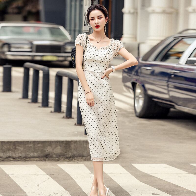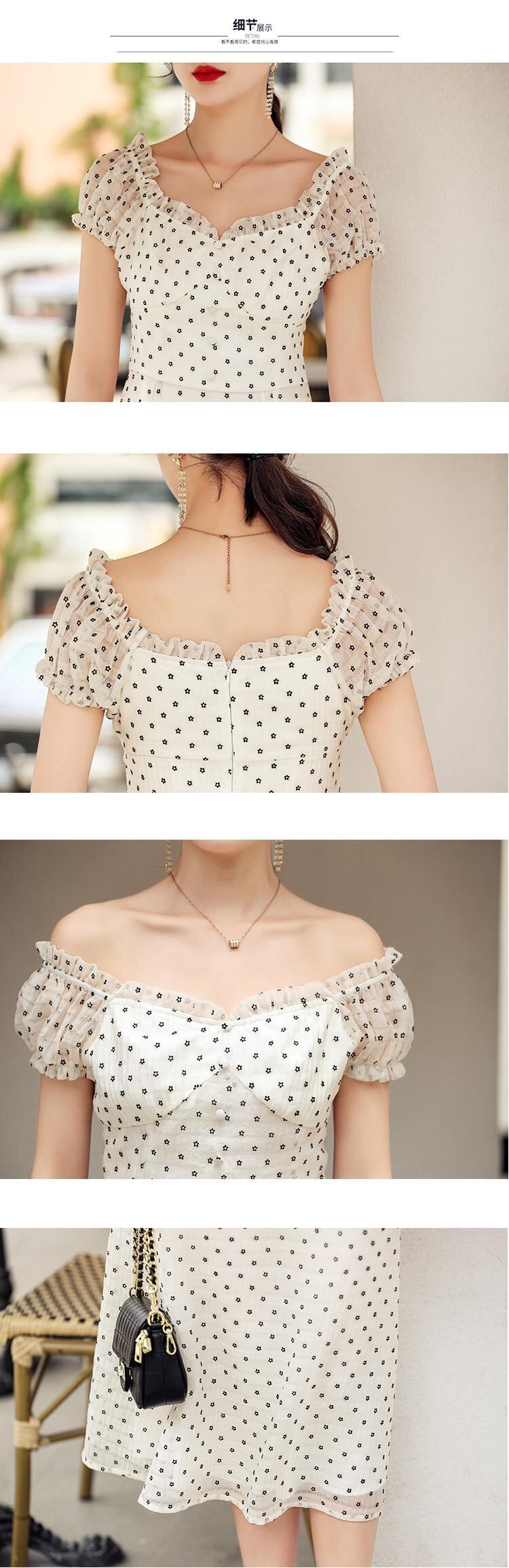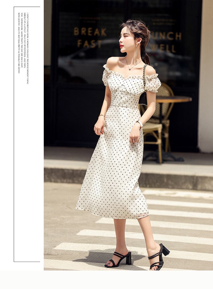 フランスのレトロなパフスリーブ水玉初恋ドレスYujieライト成熟した風ウエストセクシーなワンショルダードレス女性の夏 サマー 夏物 yingd10000730396