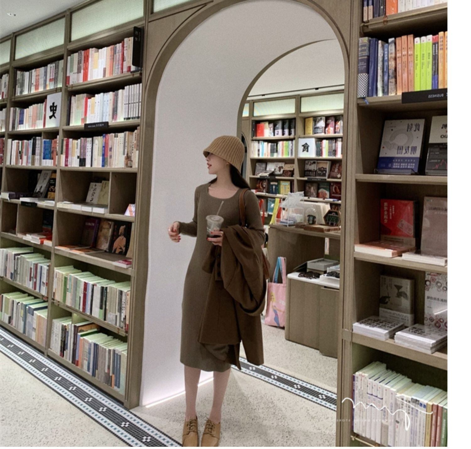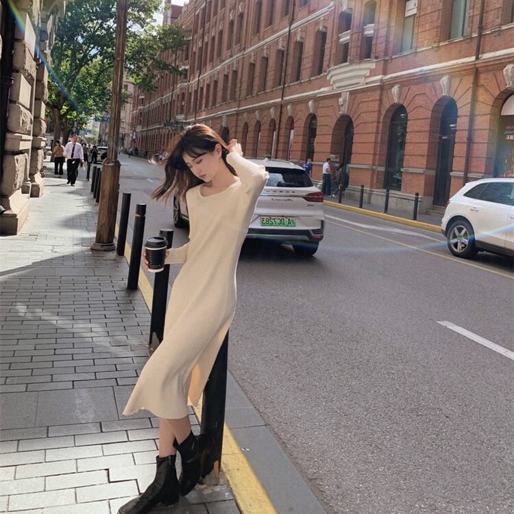 ウエストと細い気質のスクエアネックロングオーバーザニーセータードレス、女神ファン、穏やかな風、ニットドレス、女性の秋 オータム 秋物 スクウェア yingd56183751437