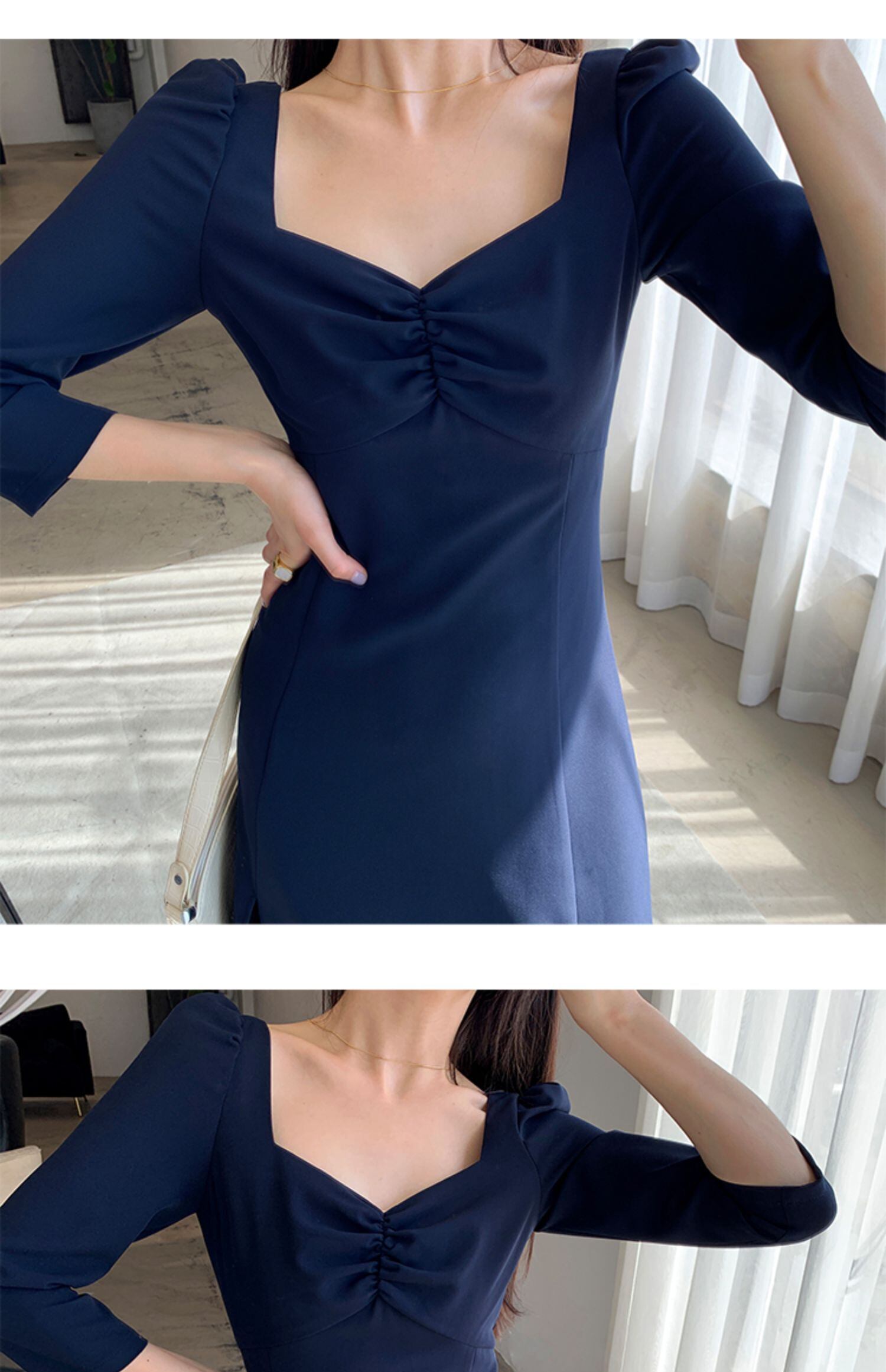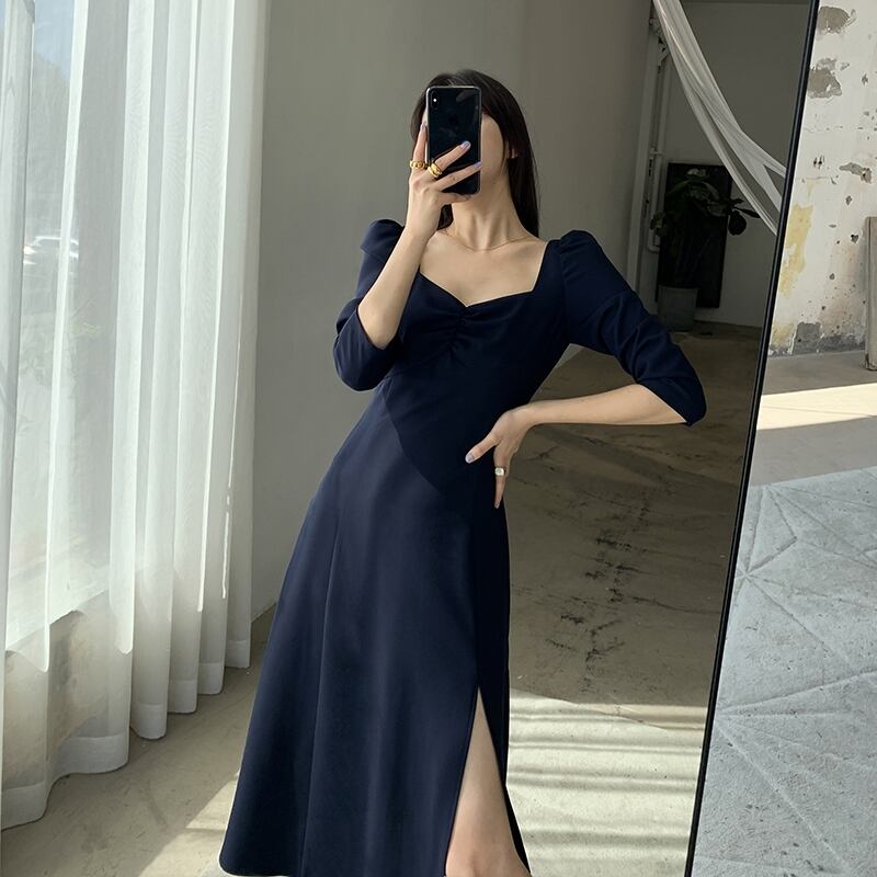 フランスのレトロシックなデザインのロングスカートウエストは細く、高級感のあるスクエアネックのヘップバーンスタイルのドレス女性秋 オータム 秋物 スクウェア yingd30193542039