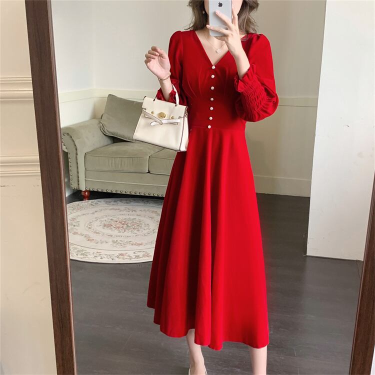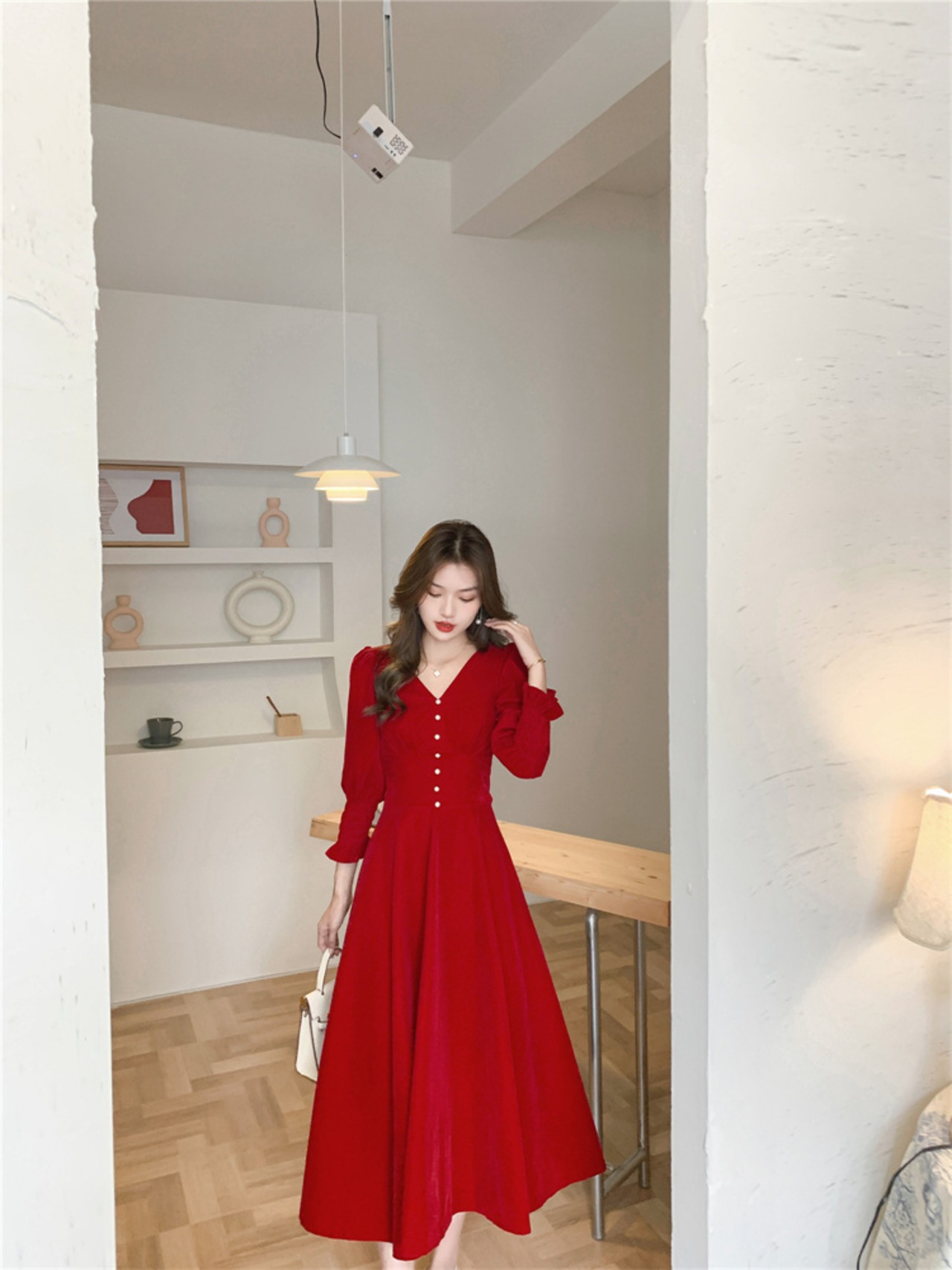 フランスのレトロなヘップバーンスタイルの赤いロングドレススリムな痩身気質高級感ライト高級長袖Vネックドレス女性 レッド yingd17475998365