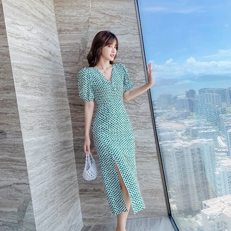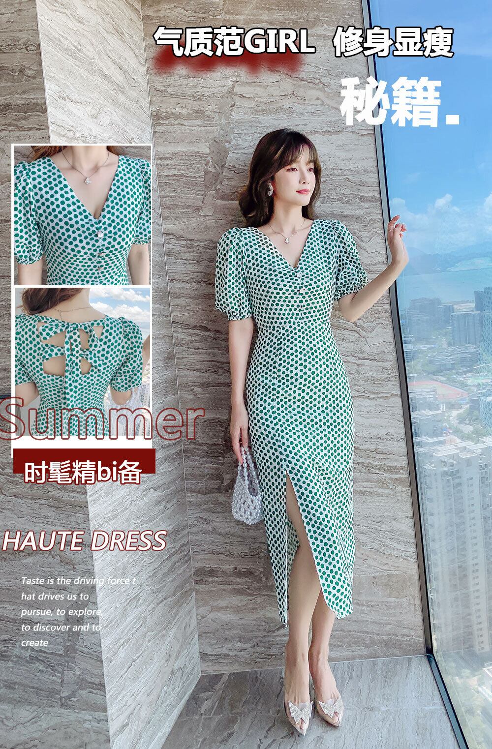 フランスの水玉ドレス2021年夏新しい優しい風甘い初恋ウエスト細い気質スプリットミドル丈スカート 大人ガーリー スウィート キュート カジュアル サマー 夏物 yingd79257720277