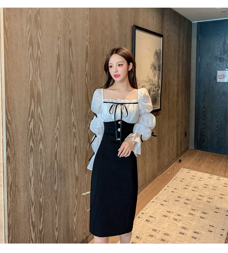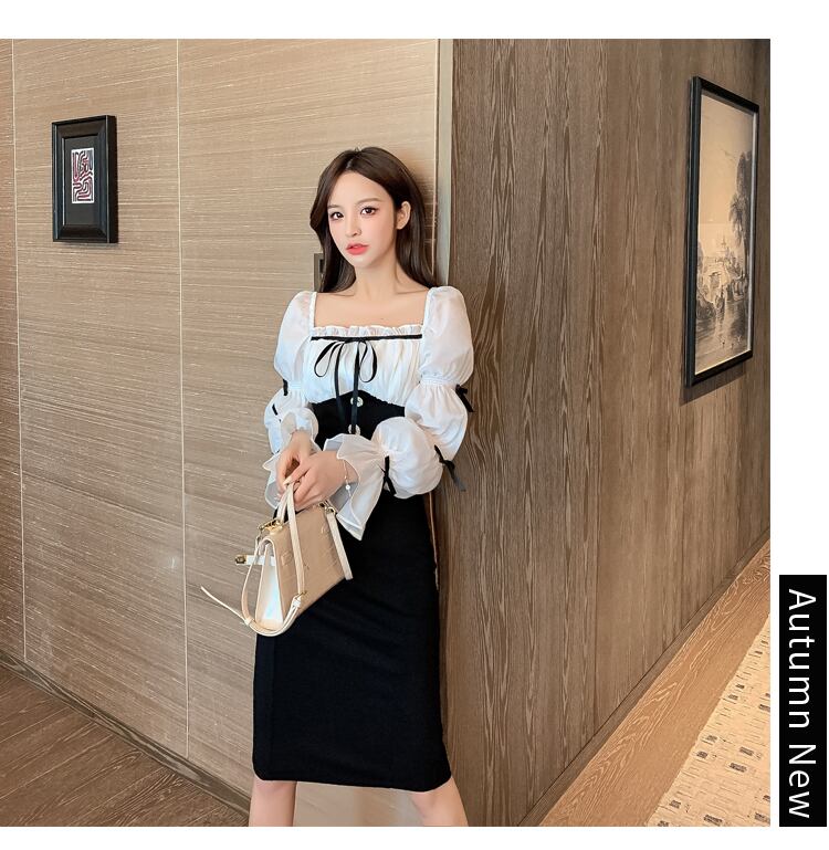 2021年春の新しい女性の軽い豪華なデザインのスカート気質セクシーなバッグヒップスクエアカラーランタンスリーブドレス女性 スプリング 春物 スクウェア yingd39080124932
