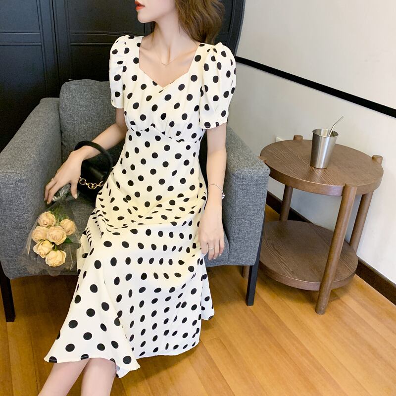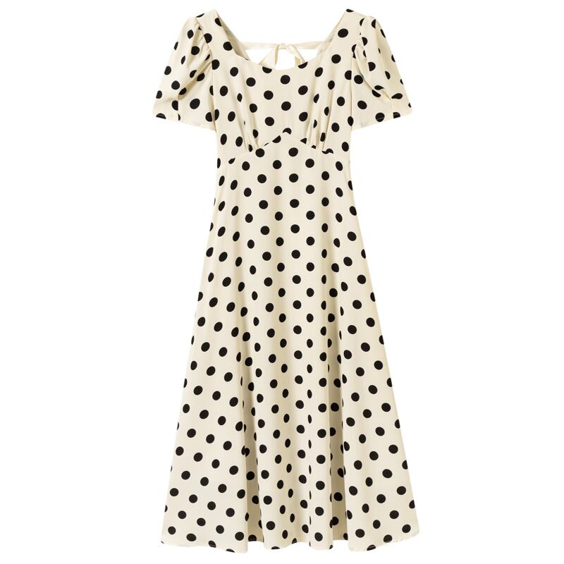 フランスのレトロなヘップバーンスタイルのスクエアネックパフスリーブ水玉ロングスカートYujieライト成熟したスタイルセクシーな背中の開いたドレス夏 サマー 夏物 スクウェア yingd32476013414