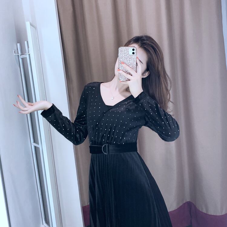 フランスのレトロなヘップバーンスタイルのリトルブラックドレスのウエストは細く、気質の軽い成熟したスタイルの長袖ベルベットドレスの女性の秋と冬 ロング オータム 秋物 ウィンター 冬物 yingd75931121134