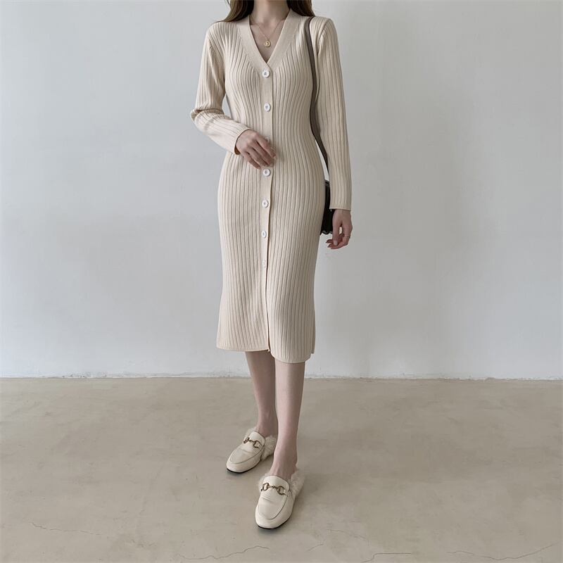 コート付き、膝上ロングセータードレス、ウエストは細く優しいスタイル、Vネックのレースアップニットワンピース、秋冬 オータム 秋物 ウィンター 冬物 yingd18343245070