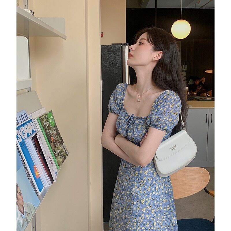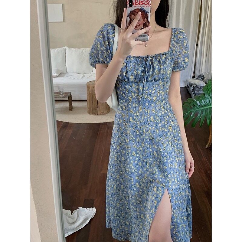 フランスのレトロなシフォンフローラルパフスリーブスクエアネックドレス女性のデザインセンスニッチセクシーなスプリットモネスカート夏 サマー 夏物 花柄 スクウェア yingd59034850681
