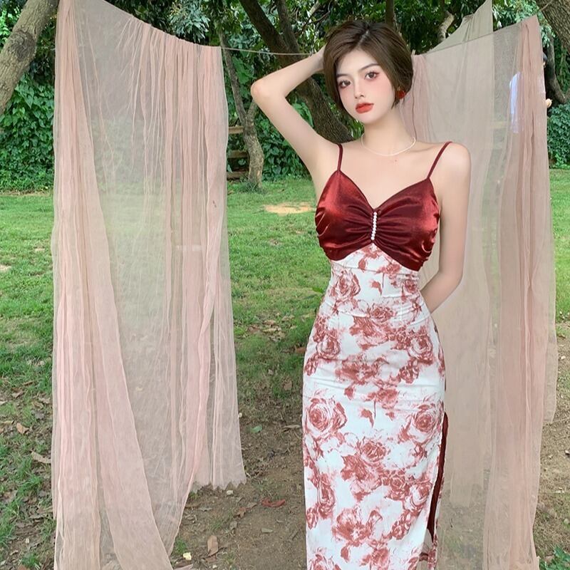 フランスのレトロな優しい風フローラルスリングロングスカートYujieライトクックスタイルセクシーバッグヒップスプリットスリングドレス夏 サマー 夏物 花柄 yingd69966299379